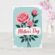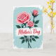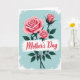 Designed with three stylized roses arranged like a close-knit trio, the illustration shows a large bloom in the upper left with pink petals shifting from soft blush to deeper fuchsia, edged with small white highlights that make it look freshly kissed. Below it sits a smaller open rose, while a slim bud rises on the right, leaning inward as if sharing a quiet moment with the others ❤️. The background is a light blue wash with gentle brush textures, especially near the edges, giving the scene a calm, airy setting. Green stems and simplified leaves add structure underneath, their steady shapes balancing the softer petals. Across the middle runs a wide white banner painted with visible strokes, creating a clear space for the message. Centered on that banner, the words “Mother’s Day” appear in flowing red lettering that stands out strongly against the white. A few soft brush marks around the banner blend it into the blue background, like a gentle breeze moving through a garden 🌼. The upper-left rose shows crisp white highlights along several petal edges, and the right-side bud points upward with a thin green stem.