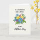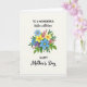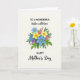 This card features a full, garden-style bouquet centered on a soft cream background, with daisy-like flowers in sky blue and sunny yellow that lean toward each other like close friends sharing a quiet moment ❤️. Lush green leaves fill out the arrangement, while small reddish-brown touches and deep purple sprigs add contrast and a cozy, romantic depth. The flowers have a gentle watercolor texture, with soft edges and light shading that makes the petals feel airy and tender. Above the bouquet, the line “TO A WONDERFUL Sister with love” sits near the top in dark lettering, with the opening words in a simple, neat type style and “with love” in a flowing cursive look. Below the bouquet, “HAPPY Mother’s Day” is placed near the bottom in the same dark color, using that flowing cursive look to echo the affectionate tone 🌼. The open, uncluttered background keeps the focus on the bouquet and the message, like a quiet pause where the words can land softly. Fine details include golden flower centers, layered leaf shapes, and tiny purple sprigs tucked between the blue and yellow blooms.