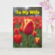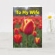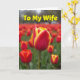 This design shows a single tulip standing in the lower center, its petals deep crimson fading into a golden-yellow edge like a gentle kiss between colors 🌷. A slim green stem rises upward, giving the flower a graceful, upright posture that feels like a quiet offering to someone dear. Behind it, a wide field of blurred blossoms in reds and warm oranges stretches back, creating a soft, dreamy setting where the foreground bloom feels like the one chosen for a close friend or sweetheart. The lighting looks diffused, as if under a light cloud cover, so the petals glow without harsh shadows and the scene stays tender. Across the upper portion, a loving dedication appears in bright yellow text with a subtle outline, standing out clearly against the softer background. The lettering sits high and centered, leaving the tulip unobstructed and drawing the eye from the message down to the flower 🐇. The background keeps its bokeh-like blur, with scattered red and orange blooms forming an undulating band toward the horizon.