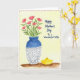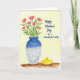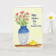 This card features a watercolor-style still life with a tall vase on the left, shaded deep indigo at the top and fading into a light gray base filled with repeating wave-like patterns. From the vase rises a bouquet of eight coral-pink flowers, their simple rounded petals leaning toward one another like a close-knit pair, with fresh green stems and leaves adding a gentle, affectionate energy ❤️. The background is a pale, buttery yellow wash that softly glows behind the arrangement, with visible brush marks that give the scene a tender, intimate feel. On the right side, the text reads “Happy Mother’s Day To a Wonderful Wife,” set in a casual handwritten look in a dark ink, stacked in short lines for easy reading. The objects rest on an earthy brown surface that feels like a tabletop, grounding the airy colors above. Near the base of the vase sits a small yellow dish with a lid, adding a sunny accent 🌼. A thin dashed red border runs around the edge, framing the vase, flowers, message, and little dish.