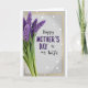 This greeting card features a tall spray of spiky purple flowers along the left side, packed with tiny florets that look soft to the touch, with slim green leaves peeking out below. On the right, the message reads “Happy MOTHER’S DAY to my Wife,” with “Happy” and “to my” in black flowing lettering and “MOTHER’S DAY” in large purple outlined letters that stand out. The word “Wife” sits just beneath, tying the words together like a quiet, affectionate note ❤️. A tender, romantic mood comes through in the way the flowers lean toward the message, as if offering the greeting directly to her. Everything is enclosed by a textured gold border that adds a gentle glow around the edges. Behind it all is a soft gray background with a faint fabric-like texture, keeping the focus on the flowers and the message 🌼. Small white light orbs are scattered across the background like floating sparkles near the top and right side.