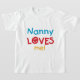 Nanny Loves Me T-shirts, cards, stickers, bodysuits bags, and more with colorful red, yellow, and blue text and heart design. These Nanny Loves me apparel and gift items will make nanny smile!
