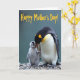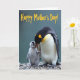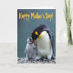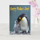 This card shows a tall adult aquatic bird leaning down toward its small, fluffy chick, their faces close as if sharing a quiet, caring moment ❤️. The adult has a sleek dark back and head with a bright white belly, plus warm golden-orange accents around the face and upper chest that draw your eye to its gentle gaze. Its long orange beak hovers just above the chick, adding a tender, almost kiss-like closeness to the scene. The chick is a soft puff of grey down with a black-and-white face pattern and wide dark eyes looking up, creating a sweet, trusting connection 🌼. Behind them, a deep teal background is softly blurred, suggesting open water or a calm coastal setting without sharp details. Underfoot, the ground is covered in a textured scatter of small pebbles in mixed earthy tones, giving the scene a natural, grounded feel. Near the top of the design, a warm yellow handwritten-style message sits above the birds, standing out clearly against the darker background. Soft, diffused light highlights the adult’s smooth feathers and the chick’s fuzzy down, with the pebbled shoreline stretching across the lower portion of the image.
