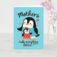This card features two stylized, flightless aquatic birds standing close together on a soft aquamarine background, with a larger bird leaning in protectively as the smaller one nestles in front. The larger bird is black and white with a gentle rosy blush on its cheeks, a bright orange beak, and a pale blue tunic trimmed with a dashed border that adds a cozy, cared-for look. The smaller companion returns the tender gaze, wearing a red cap with white stripes and a matching red dress dotted with small dark spots, with tiny orange feet peeking out below. Their rounded shapes and close posture suggest a sweet bond, like a quiet moment of friendship or family closeness ❤️. Scattered around them are small red hearts and tiny star-like accents that drift across the background, reinforcing the affectionate mood without needing extra details. There is no text shown in the artwork, leaving open space above and around the pair for a short message in a contrasting color if desired 🌼. The hearts appear in a few sizes, floating near the birds’ heads and along the upper area of the pale blue field.