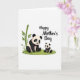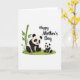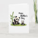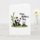 This card shows two stylized bear-like creatures with black-and-white markings sitting close together on a bright green patch of grass, their cheeks lifted in matching smiles that feel tender and affectionate ❤️. The larger adult sits slightly behind and to the side of the smaller one, creating a protective, cozy pose like they’re sharing a quiet moment. A tall segmented green stalk with a few narrow leaves rises along the left side, adding a gentle, natural frame to the scene. The background stays white and open, making the crisp outlines and saturated greens and dark tones stand out clearly. In the upper right corner, the words “Happy Mother’s Day” appear in a flowing, cursive-style lettering in dark ink, leaving plenty of breathing room around the characters. Subtle shading gives the dark fur a soft glossy look, while the grass shows faint texture that keeps the scene grounded 🌼. The adult’s broad smile and the smaller companion’s bright expression suggest closeness, like an affectionate exchange without needing extra details. The green knoll curves softly beneath them, with the bamboo-like stalk leaning slightly upward on the left.