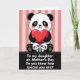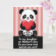This card shows a stylized bear-like figure in black and white with rosy cheeks, looking forward while holding a large glossy red heart ❤️. Below, two smaller matching figures sit close together at its feet, their tiny faces angled upward as if sharing a quiet, trusting moment. The background is filled with soft vertical stripes in muted pink tones, giving the scene a gentle, cozy setting. A dark base runs along the bottom, grounding the characters and adding contrast to the lighter upper area. Across that dark base, a short message appears in flowing white lettering, centered and easy to spot. The big heart’s shine and rounded edges add a tender, romantic touch, while the trio’s close spacing suggests affectionate companionship 🌼. The overall layout leads your eyes from the large figure down to the two small ones, like a caring embrace captured in a simple scene. The red heart sits prominently against the monochrome fur, with the pink stripes softly framing the characters from edge to edge.