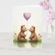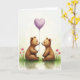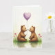 This design shows two bear-like animal characters with rounded faces and brown fur sitting opposite each other in a balanced layout, leaning in with tender eyes that suggest closeness ❤️. One holds a thin string that rises to a large heart-shaped balloon floating above them, colored a soft lavender with light highlights. Their paws rest near each other as if mid-conversation, adding a gentle, friendly romance to the scene. Behind them, the background fades into pale green and white tones like early morning mist, keeping the focus on their quiet connection. In the grass around them are pink flowers with sunny yellow centers and fresh green leaves, giving the foreground a cheerful touch 🌼. They sit on a smooth, glassy surface that reflects their bodies, the balloon, and the flowers like a calm pond. A short message sits near the top in a light-colored font, while a smaller line of text appears near the bottom in a matching tone. The heart balloon hovers centered above their heads, and its reflection forms a softer lavender shape beneath them.