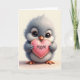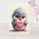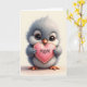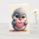 Designed with a soft digital illustration style, this card shows a round, fluffy little bird centered on a gently muted background, lit with warm, diffused light. The bird is covered in shaggy light grey-blue feathers that look touchable, and its oversized dark eyes shine with tiny reflections and delicate lashes, giving it a tender, affectionate gaze ❤️. A small ochre beak adds a cozy contrast, while tiny webbed feet rest on a pale surface at the bottom. Cradled in its soft paws is a bubblegum-pink heart-shaped treat edged with small white bead-like dots, like little pearls. Across the heart, dark lettering sits prominently in the middle, with the message clearly readable against the pink. The overall scene feels like a gentle offering between close hearts, with the bird’s careful posture and the heart held forward like a quiet gesture of care 🌼. The background stays softly blurred and minimal, keeping attention on the fluffy feathers, the glossy eyes, and the pink heart with its dark centered text.
