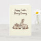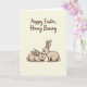 This card features two stylized rabbits cuddling close, outlined with fine lines and filled with a soft taupe tone that suggests gentle fur 🐰. One rabbit stands upright and leans in to nuzzle the other’s head, while the second reclines calmly with wide, expressive eyes that give the pair a tender, affectionate look. Light shading adds a subtle sense of depth along their ears, cheeks, and bodies, keeping the drawing simple but warm. The background is a creamy beige that feels quiet and airy, letting the rabbits remain the clear focal point. Near the top, a short Easter greeting appears in flowing cursive-style lettering, set in dark brown for strong contrast against the pale backdrop 🌷. The text is centered above the illustration, leaving comfortable open space between the words and the rabbits below. The standing rabbit’s nose touches the reclining rabbit’s forehead, and both sets of long ears curve gently inward against the soft beige field.