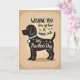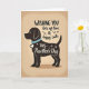 This card features a stylized dark-coated dog in side profile, drawn in deep black with a thin white outline, standing calmly as if waiting beside someone it trusts 👨. A pastel blue collar with tiny white dots wraps the neck, and a small white heart-shaped tag hangs like a quiet sign of affection. The background is warm beige with a soft fade toward the edges, giving the dog a gentle spotlight effect. Across the top, dark lettering reads “lots of love & happy tails,” with small heart shapes, paw prints, and bone icons scattered nearby to echo a friendly, caring bond. Lower on the design, the phrase “THIS Pawther’s Day” is placed over the dog’s body in matching dark text, sized large enough to stand out without covering the silhouette. The layout feels like a sweet exchange between a person and their loyal companion, with the dog’s lifted head suggesting attention and closeness 🛠️. Tiny hearts and paw prints sit near the top text, while the pale blue collar and white tag remain the brightest accents against the beige background.