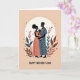 This card features a stylized trio—an adult woman, an adult man, and a baby—centered inside a pale glowing circle, all shown in soft side profiles as they lean toward one another with a tender, close-knit gaze ❤️. The woman gently cradles the baby, and both wear coral-pink outfits dotted with tiny white spots, with the baby nestled securely against her chest. She is decorated with detailed earrings and layered necklaces, adding a graceful, cared-for look to the scene. The man faces them in a calm blue tunic with matching white dots and an ornate neck detail, echoing the same pattern as if their outfits are lovingly coordinated. Behind them, a warm peach background is framed by leafy shapes in earthy brown, deep teal, and soft coral, with small red hearts tucked among the branches 🌼. The message “HAPPY MOTHER’S DAY” sits below the illustration in uppercase lettering, set in a dark tone that stands out clearly against the lighter background. The pale circle glows softly behind their heads while the surrounding leaves curl inward around the family.