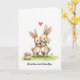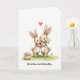 Designed with three long-eared creatures in soft pastel tones, the scene centers on two larger, light-furred figures leaning into a close embrace, their gentle eyes turned toward each other like old friends sharing a quiet moment 🐇. One of them lifts a white daisy with a yellow center, angled slightly toward the other as a small, sweet offering. To the left, a smaller youngster stands on tiptoe in the grass, reaching a tiny paw toward the pair as if asking to be included. Above them floats a bright red heart, placed high and centered to mirror the closeness below. A short Easter greeting sits near the top in a light gray font, with a smaller line of text tucked beneath it in soft pink. The background stays mostly white, giving the figures plenty of space and keeping the focus on their tender body language 🌷. At the bottom, a thin strip of green grass curves under their feet with a few simple blades and small tufts.