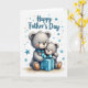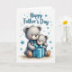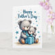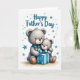 This design shows two gray, plush-like animal figures standing close together on a white background, with the larger one holding the smaller in a gentle, protective hug 👨. The larger figure wears a neat blue tie 👔, and both have soft smiles and rosy cheeks that suggest a caring, affectionate connection. The smaller figure leans in and offers a sky-blue gift box covered in tiny white dots, finished with a matching bow. Around them, small star shapes float in light blue, orange, and pale gray, adding a quiet celebratory touch. Near the top, a short Father’s Day message appears in teal lettering, centered above the characters for easy reading. The limited palette of blues and grays is warmed with peach accents on the faces, giving the scene a cozy, tender look. The overall lighting feels softly shaded, with the stars scattered loosely around the pair and the gift box held at chest height between them.
