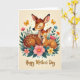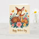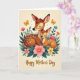 Designed with a gentle, storybook-style illustration, this card centers on two forest deer resting close together, their eyes closed and faces turned inward in a quiet, loving nuzzle ❤️. The larger deer has warm brown fur and a softly lowered head, while the smaller one is tucked alongside with pale speckles across its back, suggesting a trusting, family closeness. Behind them, a light cream background creates a calm glow that keeps the focus on their tender pose. Around the pair, a ring of stylized flowers in blush pink, soft yellow, orange, and muted blue mixes with leafy green sprigs, like a protective garden frame 🌼. Near the upper corners, two small butterflies with golden wings float in place, adding a hint of motion above the still scene. Along the bottom edge, the words “Happy Mother’s Day” appear in shimmering gold lettering, centered and easy to spot against the pale background. The outlines are smooth and the color transitions are softly shaded, giving the animals and flowers a polished, gently layered look. The butterflies sit near the top left and top right, with the floral clusters curving around the deer to form an oval border.
