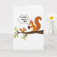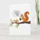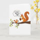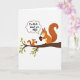 This card shows two bushy-tailed woodland animals perched close together on a diagonal tree branch against a plain white background, their bodies angled toward each other in a friendly, affectionate pause ❤️. The larger reddish-brown animal sits on the right while the smaller one sits on the left, and both hold small, dark oval seeds in their front paws as if sharing a snack. Between them, the smaller animal’s gaze lifts toward the larger one, suggesting a gentle, admiring exchange without needing extra scenery. Above the pair, a rounded, cloud-like thought bubble carries the message “I’m nuts about you,” adding a sweet joke that reads like romance or close friendship. The text inside the bubble is set in dark lettering for easy contrast, centered neatly within the shape. Lime-green leaves cluster along the branch, bringing a fresh pop of color that frames the characters and adds a hint of springtime 🌼. The branch runs from lower left to upper right, with scattered green leaves and the pale thought bubble hovering just above their heads.