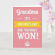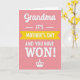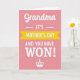 This card features a soft pastel pink background that sets a gentle, affectionate tone ❤️. Near the top center, the word “Grandma” appears in a flowing, cursive-style look in a darker contrasting color, like a tender address meant just for her. Just below it, a bright yellow horizontal banner stretches across the middle with “MOTHER’S DAY” in clear, all-caps lettering. Under the banner, the line “AND YOU HAVE WON!” sits centered in a heavier, attention-grabbing style, giving the message a fun, celebratory feel without needing any characters. The mix of smooth curves up top and strong, straightforward letters below creates a sweet contrast, like a warm hug followed by a cheerful cheer 🌼. Spacing is tidy and balanced, with the main words stacked neatly so your eye moves from top to bottom in an easy rhythm. At the bottom center, a small white crown icon is placed as a simple finishing detail against the pink backdrop.