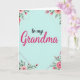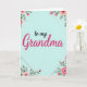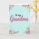 This greeting card features the phrase “to my Grandma” centered on a soft pale aqua-green background, with “to my” in small black lettering above the larger word “Grandma” in bright fuchsia. The oversized pink word curves in smooth strokes that feel like a gentle hug, turning the message into something tender and close ❤️. In each corner, clusters of stylized flowers in blush and coral tones lean inward as if gathering around the words like caring hands. Sage-green leaves and a few small buds add a quiet, nurturing touch, balancing the warmer petals 🌼. The layout keeps the text as the focal point while the florals form a loose frame that guides your eye back to the center. Subtle diagonal lines run across the background, adding a soft texture behind the lettering without competing with it. The pale aqua-green field is crossed by faint, evenly spaced diagonal stripes, while the corner florals sit in rounded clusters with pink petals and muted green leaves.