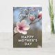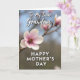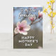 On the front of the card a single pale pink blossom opens at the center, its petals fading from a soft blush to slightly deeper pink near the textured middle, like a gentle hug held in color ❤️. A slim, slightly knotted branch runs diagonally behind it, guiding your eye toward the flower in a calm, intimate way. The background falls into a soft blur of muted greens and browns with faint blue peeking through, where a few distant blossoms appear like quiet companions 🌼. Light looks diffused and tender, brushing the petal edges so they seem almost see-through while the center stays warm and detailed. Near the top, the words “To My Dear Grandma” sit in white, flowing lettering that stands out against the softened greenery. Along the bottom, “HAPPY MOTHER’S DAY” appears in white, simple uppercase letters, balanced and easy to read. The crisp white text against the hazy garden scene feels like a close, affectionate note placed carefully over a peaceful moment. At the flower’s core, tiny curled filaments and a swirled center show touches of brown and orange, sharply defined against the dreamy background.
