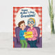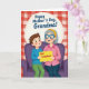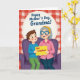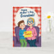 This card shows a young boy and an older woman cuddled close on a plush deep-purple armchair, their faces turned toward each other with a tender, affectionate look ❤️. The boy has bright brown hair, rosy cheeks, and a vivid blue shirt with green trousers as he smiles up at her. The woman has soft gray hair with a sunny yellow headband, blue glasses, a gentle smile, a light pink collared blouse, and dark blue trousers. Between them, they hold a bright yellow card angled toward the viewer, with red lettering centered on the front like a loving note. Behind them, a red-and-white gingham pattern fills the background, giving the room a cozy, homey setting 🌼. Near the top, a white oval area contains the greeting text, set neatly in the middle so it stands out against the patterned backdrop. Small details like the rounded chair arms, the close spacing of their hands, and the contrasting purple upholstery against the gingham background make the scene easy to picture. The white oval sits at the top center, with crisp edges and ample space around the greeting text.