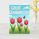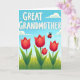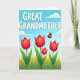 Designed with a serene outdoor scene, this card features the words “GREAT GRANDMOTHER” across the top in large, rounded white letters set against an open blue sky. The sky fades from a lighter blue near the horizon to a deeper blue above, where puffy white clouds drift like quiet companions. Below the lettering, rolling green hills stretch across the page in layered shades that suggest a soft breeze and an easy, affectionate calm ❤️. In the center of the field, four tall red flower shapes rise with gently curved petals, and a smaller bloom tucked nearby adds a tender, close-knit feel. A tiny winged beetle with a red, spotted shell hovers in midair, as if drawn toward the flowers like a friendly hello 🌼. The overall look balances cool blues with fresh greens and warm reds, giving the scene a cozy, caring mood without feeling busy. The clouds are rounded and white, spaced across the upper sky above the bright red blooms.