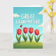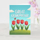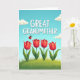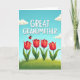 This greeting card features a calm sky-blue background with soft cloud shapes drifting near the top, setting a gentle, affectionate mood ❤️. Across the upper area, the words “GREAT GRANDMOTHER” appear in large, rounded white letters that stand out clearly against the blue. Beneath the text, a green field stretches across the lower portion, drawn with layered blades and subtle shading for a natural look. Four red tulips rise in a neat, balanced group from the grass, their petals shaded to feel velvety and cared for, like a quiet gesture of friendship in flower form 🌼. The stems are tall and green, guiding your eye upward toward the message. Between the lettering and the flowers, a small red spotted beetle floats lightly as if lingering near something dear. The tulips sit centered along the bottom edge, with the beetle hovering just above them against the open blue space.