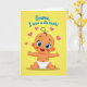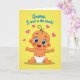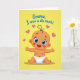 This greeting card features a stylized baby figure centered on a bright yellow background, with a warm medium skin tone and a rounded head topped by a single small black curl. Large blue eyes with fine lashes look outward with a tender, inviting gaze, while rosy cheeks and a wide open smile suggest friendly affection ❤️. The baby wears a simple white diaper, and both arms are stretched wide as if reaching for a hug. Several soft pink hearts float around the figure, adding a gentle romantic touch without crowding the scene 🌼. Near the top, curved blue text arches across the yellow space, set above the baby’s head so it’s easy to read at a glance. The lines are smooth and clear, and a small shadow beneath the feet lightly anchors the character. The overall layout keeps the baby centered, with the blue lettering overhead and the pink hearts scattered around the open-armed pose. A faint gray shadow sits directly under the baby against the flat yellow backdrop.