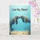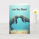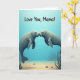 This greeting card features a calm underwater scene where two stout sea mammals float in the center, leaning nose-to-nose with a tender, affectionate gaze ❤️. Their rounded bodies are shaded in soft grays and muted blues, with small ivory tusks and large dark eyes that make the moment feel gentle and close. Light filters down from above in a pale, watery glow, giving the water a soothing gradient that moves from light sky-blue near the top to deeper blue below. Near the upper portion of the design, the message “Love You, Mama!” appears in thick, dark lettering that stands out clearly against the lighter water. The pair’s closeness reads like a quiet hug in motion, more like a loving nuzzle than a pose, adding a sweet, family feel without needing extra details 🌼. Along the lower area, the sandy seabed shows scattered smooth pebbles in earthy tones and a few thin green water plants bending as if in a slow current. The final touch is the gentle contrast between the soft-edged animals and the lightly textured background, with the text sitting above them and the plants framing the bottom edge.