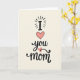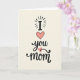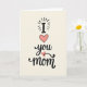 This greeting card features a tall, centered layout on a warm cream background, with the message stacked from top to bottom like a gentle note meant for someone close. At the top, a large uppercase “I” in dark charcoal sits with small radiating dash marks around it, like a quiet spotlight on the first word. Just below, a big soft-pink heart with a thin dark outline takes center stage, setting a tender, affectionate tone ❤️. Beneath the heart, the word “you” appears in flowing dark lettering, curving smoothly as if written by someone leaning in with care. A smaller pale-pink heart is tucked into a curl near the lower part of “you,” adding a sweet little pause in the line 🌼. At the bottom, the word “mom” is placed firmly in the same dark color, slightly thicker and more grounded than the word above. Subtle texture inside the hearts and slight brush-like variation in the dark lettering give the design a cozy, intimate look. The overall palette stays simple—cream, charcoal, and pink—with the two hearts standing out as the main visual accents.