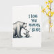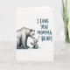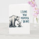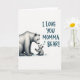 This card shows two bear-like characters on a wide white background, with a larger, motherly figure on the left leaning her head down toward a smaller cub. The cub looks up with an affectionate, trusting gaze, tiny paws lifted as if reaching for a hug, adding a gentle romance of family closeness ❤️. Soft gray-and-white fur is shaded with light washes that make them look plush and calm, as if lit by a quiet morning glow. The open space around them keeps the focus on their tender eye contact and the small gap between their noses. On the right side, the message “I LOVE YOU MOMMA BEAR!” is set in teal lettering, standing out clearly against the white. Two small teal hearts sit near the words, echoing the sweet connection between the pair 🌼. A thin tuft of green grass rests beneath the cub’s feet at the bottom left.