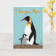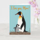 On the front of the card a large adult flightless bird stands in the lower half, with a deep black back, a bright white belly, and a warm yellow-to-orange glow across the neck and chest that matches its orange beak. Tucked close beside it, a smaller young bird stands in a twiggy brown nest, colored in soft grey with a white face and a dark cap, echoing the adult’s upright stance. The little one tilts its gaze upward toward the bigger bird, and their closeness reads like a quiet, affectionate moment ❤️. Behind them, a wide sky-blue background stays simple and airy, giving the pair lots of open space. Near the top, the message “I love you, Mom!” appears in orange lettering, centered above the birds and easy to spot. The orange text ties neatly to the warm tones on the adult bird, adding a sunny touch 🌼. The nest is built from thin, intertwined brown twigs with a few small branch tips peeking outward.