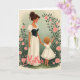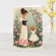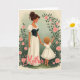 This card shows a gentle scene of a woman and a small child standing close, their fingers lightly linked in a quiet, affectionate moment ❤️. The woman has neatly styled auburn hair and a soft downward gaze, wearing a flowing ivory skirt, a white blouse with puffed sleeves and lace edging, and a dark fitted bodice with small gold buttons. The child is seen from behind with a tumble of golden curls, dressed in a simple white outfit, one arm reaching toward nearby flowers as if inviting the woman to look along with them. Around them, an arched frame of green vines and soft pink roses creates a garden setting that feels tender and calm, like a shared walk among blooms 🌼. The background stays muted and lightly textured, letting the creamy whites, pastel greens, and blush tones stand out with a warm, diffused glow. Near the bottom, the word “Mother” appears in large decorative lettering in a darker tone, centered as a clear focal point beneath the figures. Small details like the child’s bare feet and the rose buds at different stages of opening add a natural, intimate touch within the vine-covered arch.