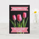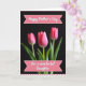 This card features three closed pink tulip-like blossoms set against a deep, velvety black background, creating a quiet, romantic contrast ❤️. The center bloom is sharply detailed, with petals shifting from soft blush to deeper fuchsia, as if holding a tender secret. The two side flowers fade slightly out of focus, like close companions leaning in to frame the main bloom. Fresh green stems and slim leaves rise from below, adding a calm, natural balance to the pink tones. Soft lighting brushes across the petals, giving them a smooth, satin-like look and a gentle glow. Near the top and bottom, two pale pink ribbon banners with small white polka dots hold dark lettering, placed neatly within each ribbon shape. Along the outer edge, a red-and-white gingham border outlines the design like a stitched frame 🌼.