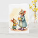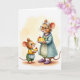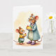 This card shows two rodent-like characters sharing a sweet moment in a softly lit, cozy setting ❤️. An older female figure with white hair, round spectacles, a blue-green coat, and a strand of purple beads looks down with a gentle smile as she offers a slice of golden cheesecake on a white plate. Across from her, a younger companion in a yellow top, green overalls, and a striped apron holds a matching slice, leaning in with rosy cheeks and bright, eager eyes. The background is a wash of cream and pale gold, like light drifting through a kitchen, keeping the focus on their tender exchange. The main text sits near the top in a warm, medium-toned color that stands out softly against the pale backdrop, with a smaller line of text placed beneath it in a darker shade. Their clothing details add intimacy—stitched textures, soft fur, and the older figure’s purple embroidered slippers suggest comfort and care 🌼. Two glossy red cherries crown the cake slices, catching the light against the muted, creamy tones.