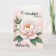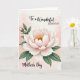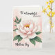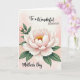 Designed with a serene floral scene, the card centers on a large, many-petaled blossom that opens like a gentle embrace, suggesting closeness and affection ❤️. The petals fade from soft blush pink near the middle to luminous white along the edges, giving the flower a tender glow. In the center, golden-yellow stamens add a warm focal point, like a small burst of sunshine 🌼. To the left, a smaller bud leans in beside broad deep-green leaves, creating a quiet, companionable pairing in the composition. The background is a pale rose-and-cream wash with a soft, airy look that keeps everything calm and intimate. Along the top, the message “To a Wonderful Daughter” appears in flowing lettering, with “DAUGHTER” set in a clearer, more structured style, both in a dark tone for easy reading. Near the bottom, “Mother’s Day” sits neatly in matching dark text, balanced under the bloom. The main flower sits slightly right of center, with the bud and leaves extending from the left against the gentle watercolor-like backdrop.