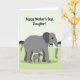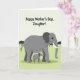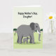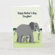 This design shows two grey elephants centered on a light green ground, sharing a close, affectionate moment that feels like a quiet hug ❤️. The larger adult stands across the lower half of the scene with a calm, protective stance, while the smaller youngster nestles under its body, leaning in as if reassured by the adult’s steady presence. Their faces angle toward each other with a tender, trusting look, and the adult’s large ear and single visible tusk are gently detailed along the curve of its trunk. The background stays simple, suggesting an open grassy plain with a few spaced-out trees that keep the focus on the pair. Those trees have dark green rounded canopies and slim brown trunks, adding a soft sense of distance and fresh air 🌼. Near the top, a short greeting line sits above the elephants in dark green lettering, spaced evenly and easy to read against the pale sky. The lighting is bright and even, and the scene includes just a small cluster of trees off to one side behind the elephants.