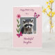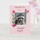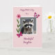 This card features a close-up portrait of a small masked mammal with soft gray-brown fur and glossy dark eyes that look straight ahead with gentle curiosity ❤️. A white frame surrounds the image, and behind the animal is a smooth pastel pink background that sets a tender, affectionate mood. Along the left side, a bright pink flower rises on a green stem, adding a fresh, friendly touch 🌼. Two butterflies in shades of pink and deep magenta hover near the corners, as if drifting in to keep the little creature company. The animal’s calm gaze and relaxed face create the feel of a quiet bond, like a soft moment shared between close friends. A short message appears over the pink background in flowing magenta lettering, placed across the upper portion of the design. The butterflies sit at the upper right and lower left corners, with the blossom aligned vertically along the left edge inside the white border.