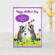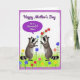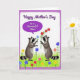 This card shows two small, raccoon-like forest animals with masked faces and striped tails standing in a lush green meadow, turned toward each other with a gentle, affectionate gaze ❤️. Bright little flowers dot the grass in red, blue, yellow, and pink, adding a cheerful, outdoorsy setting around them. One animal reaches forward with a single light-blue bloom, while the other offers a small bunch of red flowers, like a quiet exchange between close friends. Above the scene, a rounded purple speech bubble holds the message in white cursive-style lettering: “Happy Mother’s Day to a Wonderful Niece.” The lettering sits centered inside the bubble and stands out clearly against the purple background. A soft purple border frames the whole illustration, keeping the focus on the pair and their shared bouquet moment 🌼. Fine touches suggest fuzzy fur and individual blades of grass, with the colorful blossoms scattered across the field beneath their feet.