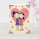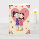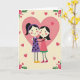 This card shows two simplified, cheerful figures hugging closely, their dot eyes and small curved smiles turned toward each other in a tender, friendly pose ❤️. The scene uses creamy off-white and soft blush tones, with gentle shading that makes the shapes look layered. Behind them sits a large pale-pink heart that frames their embrace like a soft backdrop. One figure wears a purple dress with black polka dots and a matching hair bow, while the other wears a deep pink dress with a thin green trim along the hem. Around the main heart, smaller hearts drift in different pink shades, adding a light, affectionate rhythm across the space. The corners are decorated with small flowers and leafy sprigs, giving the setting a garden-like touch 🌼. Any text is placed near the top in a warm pink color, standing out clearly against the off-white background. More tiny hearts and floral accents scatter gently around the edges, with the largest heart centered behind the pair.