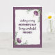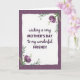 This card features a soft-edged white panel centered on a deep plum background with a subtle waffle-like texture. In the middle of the white space, the message reads “wishing a very MOTHER’S DAY to my wonderful FRIEND!” with “MOTHER’S DAY” in uppercase and the surrounding words in flowing lettering, all in dark violet. The contrast between the crisp white panel and the moody purple backdrop sets a cozy, close-friend warmth, like a gentle hug in card form ❤️. Two corner floral clusters frame the message, suggesting a caring bond through their balanced, reaching shapes rather than anything loud or flashy. The blossoms are painted in light lavender tones with soft shading, paired with calm green leaves and thin curling tendrils. The text sits neatly centered, leaving comfortable margins so the flowers feel like they’re leaning in toward the words 🌼. In the top-left and bottom-right corners, the lavender blooms and green foliage curl inward along the panel’s edges.