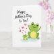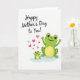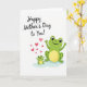 This card shows two stylized amphibian characters in shades of green with sunny yellow accents, set against a bright white background. A larger one stands at the lower right with arms open wide and a big smile, as if inviting a hug ❤️. Beside it, a smaller companion mirrors the pose and tilts its face upward with an admiring look that feels like close friendship or family affection. They stand on a soft, light blue shape that suggests a gentle patch of ground or a lily pad. From the smaller character, several floating hearts rise in a loose trail, shifting from pale pink to deep red, like a shy but growing rush of love. In the upper left, a message appears in a flowing, handwritten-style font in a dark tone, leaving plenty of open space around it for a calm, airy layout 🌼. The hearts curl upward between the two figures and toward the message area, with the light blue base sitting beneath their feet.