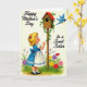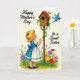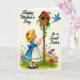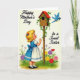 This greeting card features a fair-haired young girl shown in profile, her eyes lifted with a tender, curious look that feels like a quiet moment shared with someone close ❤️. She wears a blue dress with a white apron and a large blue bow at her back, standing on a lush patch of green grass. Around her, wildflowers scatter in reds, yellows, purples, and pinks, creating a soft garden setting that hints at gentle affection. Near the center sits a rustic wooden birdhouse with a bright red roof, giving the scene a cozy focal point. Green ivy winds up the birdhouse post in curling strands, adding a natural frame as if the garden is leaning in for a friendly embrace 🌼. A blue bird with a touch of yellow is captured mid-flight as it approaches the birdhouse, bringing a light sense of motion to the calm view. A short message appears within the frame in flowing lettering, set in a dark ink that stands out against the pale background, with the words arranged neatly above and beside the central illustration. The birdhouse roof is painted a clear red, and the ivy leaves are shaded in layered greens along the post.