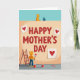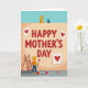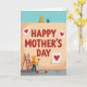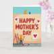 Designed with a gentle, storybook-style illustration, this card shows a calm two-tone setting with a beige wall below and a soft blue band above. Across the center of the beige wall, large red letters spell “HAPPY MOTHER’S DAY,” looking freshly painted and slightly uneven in a charming way. Near the lower left, a golden bear in blue trousers stands beside a wooden ladder, holding a paintbrush as if adding the final strokes with quiet care ❤️. On the muted gray floor, a couple of red paint cans sit among small splatters, suggesting a busy, affectionate project in progress. Along the wall, several small square notes are stuck up, each marked with a red heart, like little reminders of love 🌼. Up on the top edge of the wall, a smaller golden bear watches with a gentle smile while a tiny sky-blue bird perches nearby, their closeness adding a friendly, supportive feel. The warm lighting softens the textures and shadows, making the scene feel cozy and lived-in. The red heart notes dot the beige wall around the message, with the blue upper section forming a calm border above.