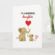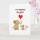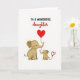 This card shows two soft, rounded elephant figures in warm tan tones on a plain white background, with gentle eyes and small rosy cheek blush that makes their bond feel close ❤️. The larger elephant stands calmly, leaning its trunk toward the smaller one as if watching over it with quiet affection. Its trunk holds a thin string attached to a solid red, heart-shaped balloon floating above, adding a romantic, loving touch to the scene. Next to it, the smaller elephant sits with a tiny trunk reaching up to hold the string of a smaller heart balloon drawn as a red outline, like it’s copying the grown-up with pride. Near the top, the text “TO A WONDERFUL” appears in black, all caps, in a simple sans-serif style, centered above the animals. Directly beneath that, the word “daughter” is written in red with flowing letterforms, matching the balloon color, and it sits slightly larger to stand out 🌼. The two heart balloons hover above the elephants, one filled red and one red outline, each tethered by a thin line that curves gently upward.
