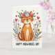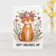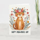 Designed with a stylized orange cat sitting calmly at center, the illustration shows closed, upward-curving eyes and rosy cheeks that read like a soft, affectionate smile ❤️. A crown of pink and white flowers with green leaves rests on its head, adding a sweet, cared-for look, as if someone just placed it there with a fond grin. Around the cat, tall, slim plants rise on both sides, dotted with small yellow blooms, reddish buds, and red heart-shaped flowers that feel like little love notes in the garden. A few floating hearts in warm golden-brown and deep red drift nearby, echoing the gentle, friendly mood without needing any extra fuss. The background stays very light and airy, helping the cat’s stripes and the greenery stand out clearly. Near the bottom, a short line of text sits centered in a warm red tone, tucked beneath the main illustration. The overall palette leans on warm oranges, leafy greens, pinks, and reds, with scattered heart shapes and tiny blossoms 🌼.