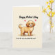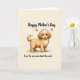 This card shows a golden-toned puppy centered on a creamy background, looking straight ahead with big dark eyes that feel tender and devoted ❤️. Its fur is shaded in soft layers of amber and tawny color, giving it a cozy, fluffy look, while the small paws and curled tail add a friendly, companion-like charm. Near the top, the words “Happy Mother’s Day” appear in flowing lettering, set in a dark tone for strong contrast against the light backdrop. Two small pink hearts sit beside the top line, like a quiet sign of affection between a pet and its favorite person 🌼. Below the puppy, a second line of text reads “From the one who sheds the most,” placed neatly under the illustration in a darker shade that stays easy to read. The simple layout leaves plenty of open space, keeping the focus on the pup’s sweet expression and the gentle humor in the message. Warm highlights along the ears and face make the puppy look softly lit, with subtle shadows under the body grounding it on the page. The two pink hearts float near the top text, and the puppy’s tail curls to the side above its back legs.