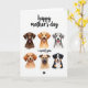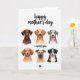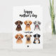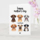 This card shows a white background with six digital dog portraits arranged in a neat grid of two rows of three, each pup facing forward with an open-mouthed grin and a little pink tongue that feels like a friendly “I’m glad you’re here.” The top row features a rich chocolate-brown dog, a sunny golden-coated dog, and a smart-looking grey-and-white patterned dog whose bright eyes seem to meet yours with gentle attention. The bottom row continues with a warm amber-coated dog, a calm tan dog with a soft, steady gaze, and a tricolor dog with black, white, and burnished orange patches that looks ready to nuzzle close ❤️. Across the upper area, the phrase “happy mother’s day” appears in a flowing, cursive-style font in black. Between the two rows, the words “i woof you” sit centered in black, linking the faces like a shared secret of affection 🌼. The lighting stays bright and even, bringing out the texture-like shading in each coat and making every expression feel tender and companionable. At the very bottom, a single black paw print sits centered beneath the grid.