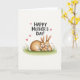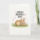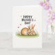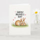Designed with a gentle family scene, the artwork shows three bunny-like animals cuddled close, with a larger brown one wrapping its arms around a smaller companion while a tiny baby nestles safely between them ❤️. Their rounded eyes meet with a tender, affectionate look, and soft pink inner ears and rosy cheeks add a sweet, caring mood. Subtle shading gives their fur a plush, cozy depth, especially on the small white tails. They sit on a rich green patch of grass sprinkled with little pink flowers and thin blades, suggesting a calm outdoor moment 🌼. A wide white background keeps the focus on the trio and makes the colors stand out without feeling busy. Near the top, dark lettering reads a cheerful Mother’s Day message, set above the characters and spaced so it feels airy. Several small red hearts float around the words and gently frame the scene. The hearts are clustered near the upper text while the family group fills the lower portion against the bright white space.