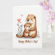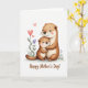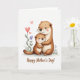 This design shows two rounded, river-dwelling mammals in the center, with the larger one wrapping its arms around a smaller one in a snug cuddle that reads as affectionate and protective ❤️. Their fur is painted in soft warm browns and creamy beige with a smooth, watercolor-like look, and both faces show wide smiles, rosy cheeks, and bright eyes turned toward each other. The background stays mostly white, keeping the pair as the main focus while adding a light, airy feel. Around them are small sprigs of green leaves and tiny heart-shaped flowers in muted red and gentle purple, like a quiet garden accent. A few floating hearts drift near their heads, reinforcing the closeness in the way the smaller one leans in and relaxes. Below the illustration, a short Mother’s Day message sits centered near the bottom in a flowing, dark-toned lettering. Small floral and heart accents echo the message area, tying the lower text to the image above 🌼. The two cuddling figures are framed by scattered hearts and leaf sprigs on the white background.