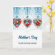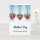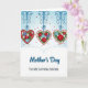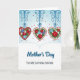 This card features three heart-shaped floral arrangements made of red, white, and blue blossoms nestled in rich green leaves, hanging like sweet keepsakes that suggest closeness and care ❤️. Each heart is suspended from curling blue ribbons that loop and twine above them, as if gently tying the trio together like family bonds. The background fades from deeper to lighter sky blue and is sprinkled with small red dots that add a light, festive touch. Every flower is drawn with careful petal shapes and tiny yellow centers, giving the bouquets a textured, stitched-like look that feels lovingly detailed. A soft, wavy white divider runs horizontally to separate the busy floral scene from the open space below. In the lower section, the words “Mother’s Day” sit centered in medium-blue lettering, with “TO MY LOVING SISTER” placed beneath in smaller, neat, all-cap letters. A small 🌼 detail appears among the blossoms, helping the hearts feel even more tender and affectionate. The lower area stays bright white with the blue text centered under the scalloped border.