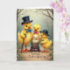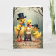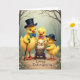 Designed with a soft spring scene, this card features three fluffy yellow bird characters gathered along an earthen path, their gentle poses suggesting close friendship. On the left, the tallest bird wears a dark top hat, a blue bow tie, and carries a slim black cane, standing with a calm, caring posture beside a smaller bird in a pink bow tie. In the middle, a tiny creamy-white woolly animal sits snugly in a rustic wooden cart, looking up with wide eyes as if listening closely. To the right, a smaller bird in a dark brimmed hat holds fresh green sprigs forward, like a shy offering meant to make the little rider smile 🐰. The ground is edged with green grass dotted with small white blossoms, and the background fades into muted greens and grays with bare trees that hint at winter just passing. Near the top, the words “Loving Easter Greeting” appear in a soft, dark tone, centered above the characters without covering the artwork 🌷. The cart’s wooden slats and rounded wheels are lightly shaded, with the green sprigs angled toward the cart’s front corner.